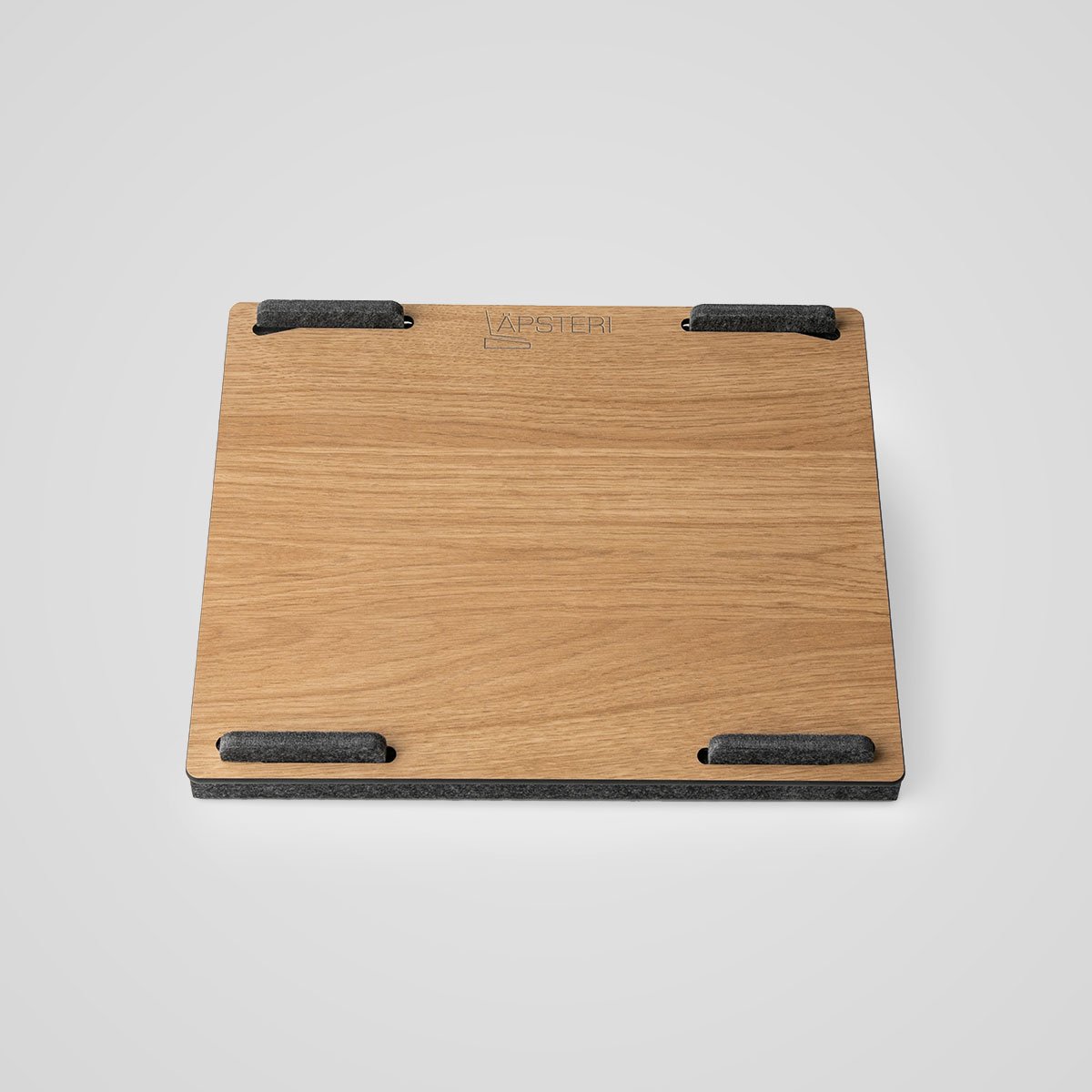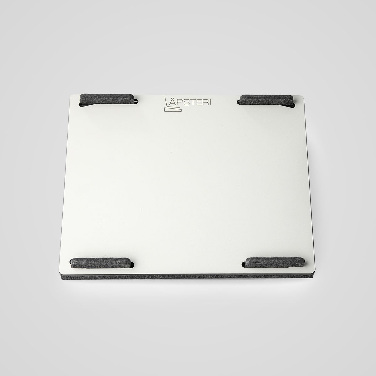 Läpsteri-sylitaso on täysin kotimainen tuote, valmistusta ja raaka-aineita myöten. Läpsteri-sylitason kansi on kotimaista massiivilaminaattia, ja sitä on saatavana valkoisena tai tammiviiluna. Kannen alla on kolmion mallinen tyhjä tila. Tilaa voit käyttää esim. laturin tai kannettavan tietokoneen säilytykseen. Alusta on kierrätetyistä pullonkorkeista valmistettua, huopamaista materiaalia, väriltään tummanharmaa. Tyylikäs kokonaisuus, laadukas viimeistely ja laadukkaat materiaalit henkivät kotimaisuutta ja pitkäikäisyyttä.