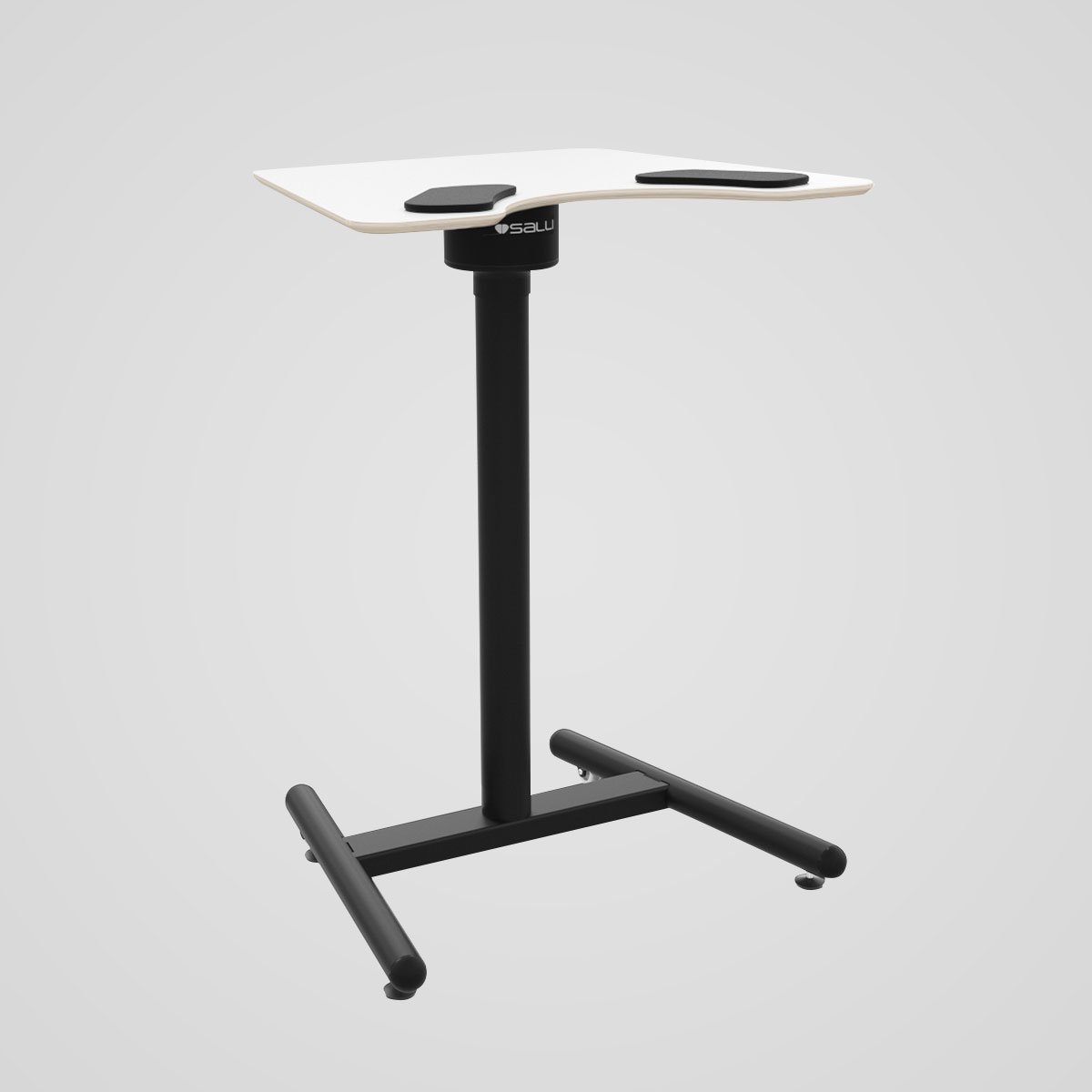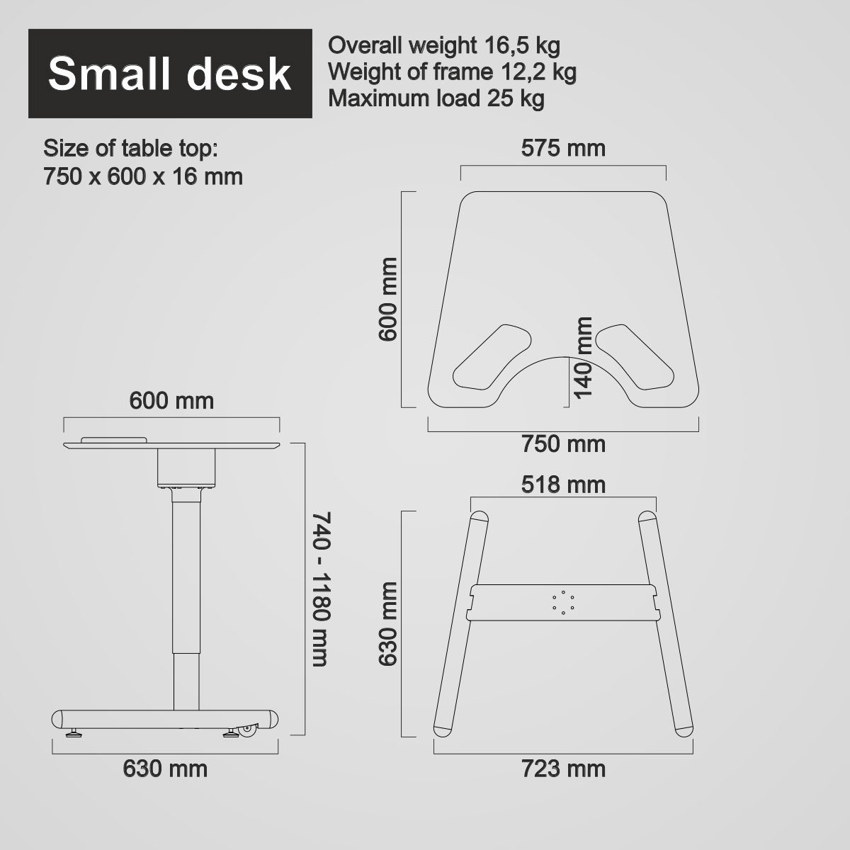 Etsitkö pientä korkeussäädettävää työpöytää? Salli Small Desk on laadukas kaasujousella säätyvä pöytä, joka mahtuu ahtaaseenkin tilaan. Pöydän kansi on kokoa 75 x 60 x 1,5cm. Kooltaan pöytä soveltuu parhaiten kannettavalle tietokoneelle tai koulupöydäksi. Salli Small Desk mahdollistaa työskentelyn niin istuen kuin seistenkin. Korkeus säätyy portaattomasti välille 74-118 cm. Pöytälevyyn tehty syvennys / mahakolo optimoi työskentelyasennon ergonomisuuden, koska se mahdollistaa hyvän tuen kyynärvarsille ja hartioille. Työskentelymukavuuden kruunaa pöydän mukana tulevat ErgoRoll -kyynärpehmusteet, jotka ovat valmistettu kimmoisuutensa hyvin säilyttävästä polyuretaanista. Salli Small Desk poikkeaa monesta muusta pikkupöydästä sillä, että se on kaksijalkainen. Useissa pienissä työpöydissä on yksi jalka ja suuri jalkavaste. Ongelma yksijalkaisten pöytien kanssa on se, että useimpien tuolien jalkaristikko ottaa kiinni jalkavasteeseen. Tätä ongelmaa ei ole Salli Small Deskin kanssa.