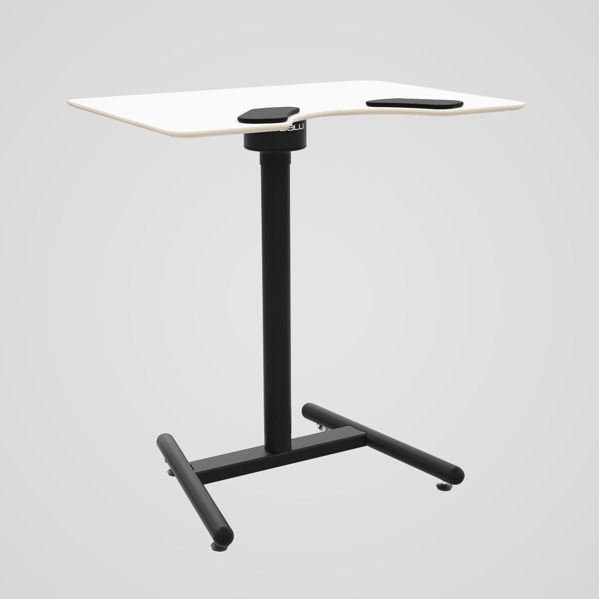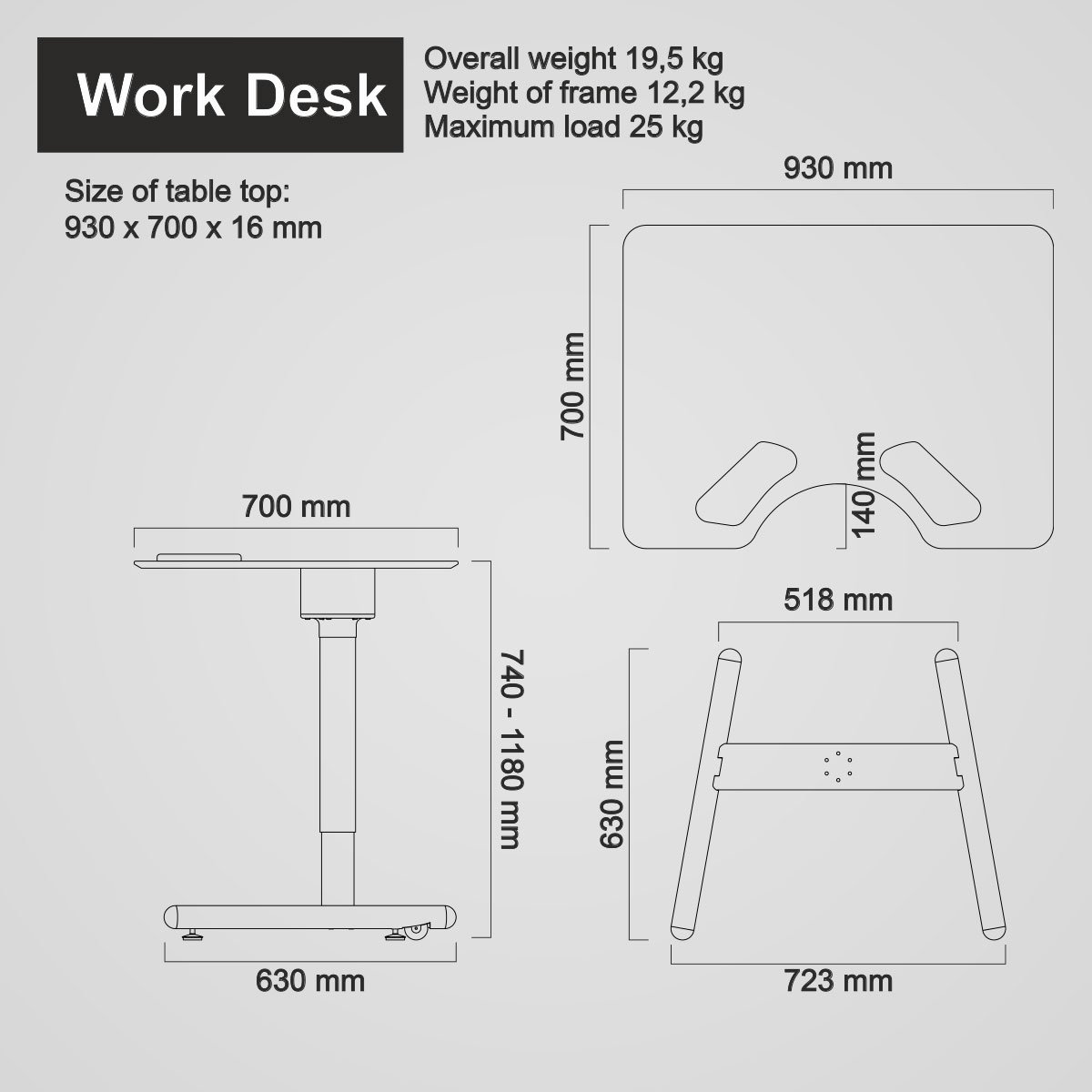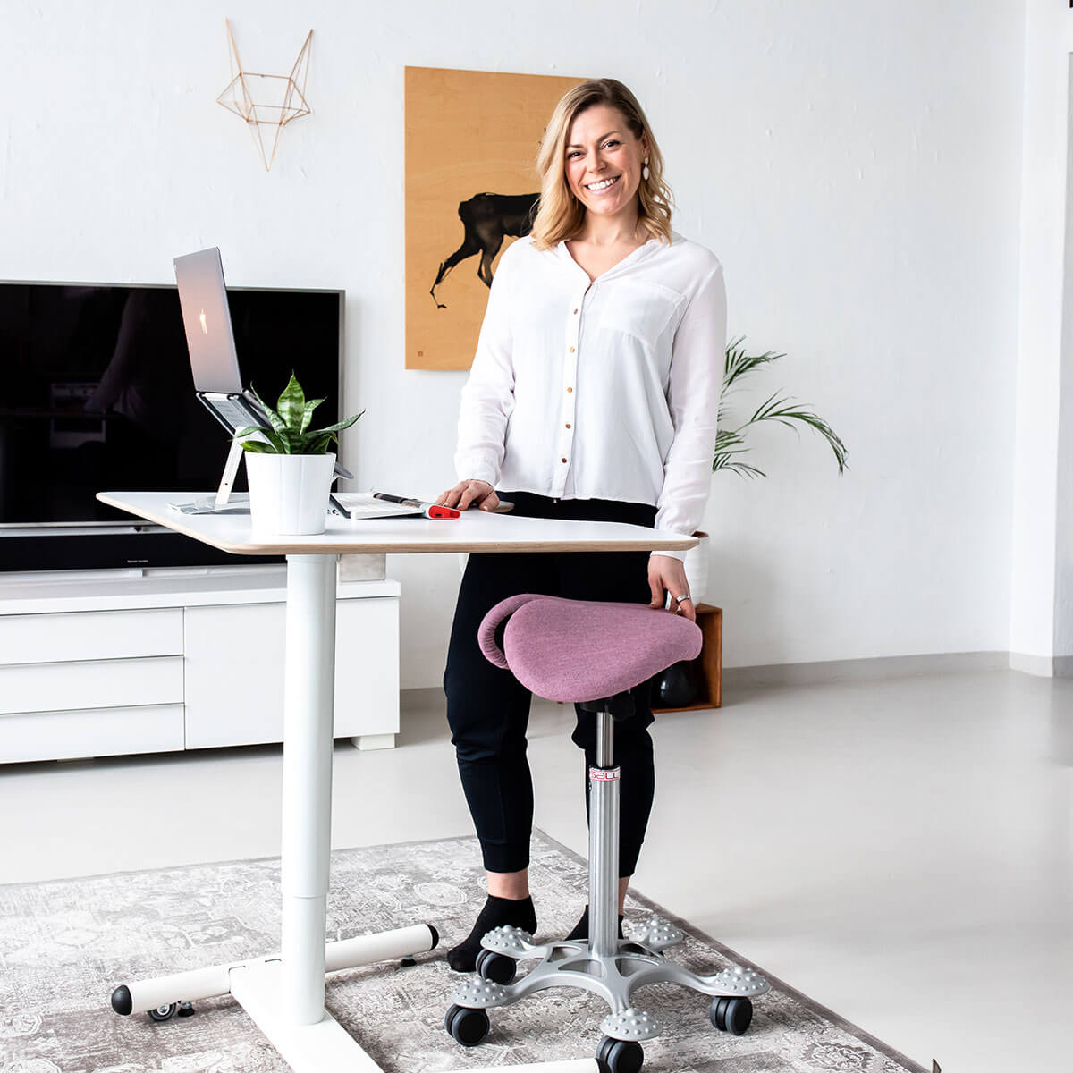 Salli Work Desk on kompaktin kokoinen työpöytä etätyöpisteeseen tai pieneen toimistoon. Pöytälevyn koko on 93 x 70 x 1,6cm, joten pöytälevylle mahtuu hyvin kannettava kone tai näyttö. Pöytälevyyn tehty syvennys / mahakolo optimoi työskentelyasennon ergonomisuuden, koska se mahdollistaa hyvän tuen kyynärvarsille ja hartioille. Työskentelymukavuuden kruunaa pöydän mukana tulevat ErgoRoll -kyynärpehmusteet, jotka on valmistettu kimmoisuutensa hyvin säilyttävästä polyuretaanista. Pöydän korkeus säätyy kaasujousella näppärästi ja portaattomasti. Korkeudensäätöväli on 74-118 cm. Pöydän ääressä voi siis työskennellä istuen, seisten tai vaikkapa tasapainolaudan kanssa. Salli Work Desk poikkeaa monesta saman kokoluokan pöydästä sillä, että se on kaksijalkainen. Useissa pienissä työpöydissä on yksi jalka ja suuri jalkavaste. Ongelma yksijalkaisten pöytien kanssa on se, että useimpien tuolien jalkaristikko ottaa kiinni jalkavasteeseen. Tätä ongelmaa ei ole Salli Small Deskin kanssa.